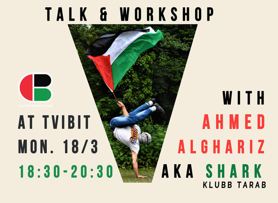 Join us for an exciting talk and workshop with Ahmed Alghariz aka Shark on Monday the 18th of March at Tvibit. First we will have a short conversation with Ahmed about his practice followed by a workshop on how to release your stress through movement.Ahmed is an emergency trauma counselor and dance therapist based in Germany. He is the co-founder of the dance school Camps Breakerz in Nuseirat refugee camp in Gaza where he has taught several generations of kids.
